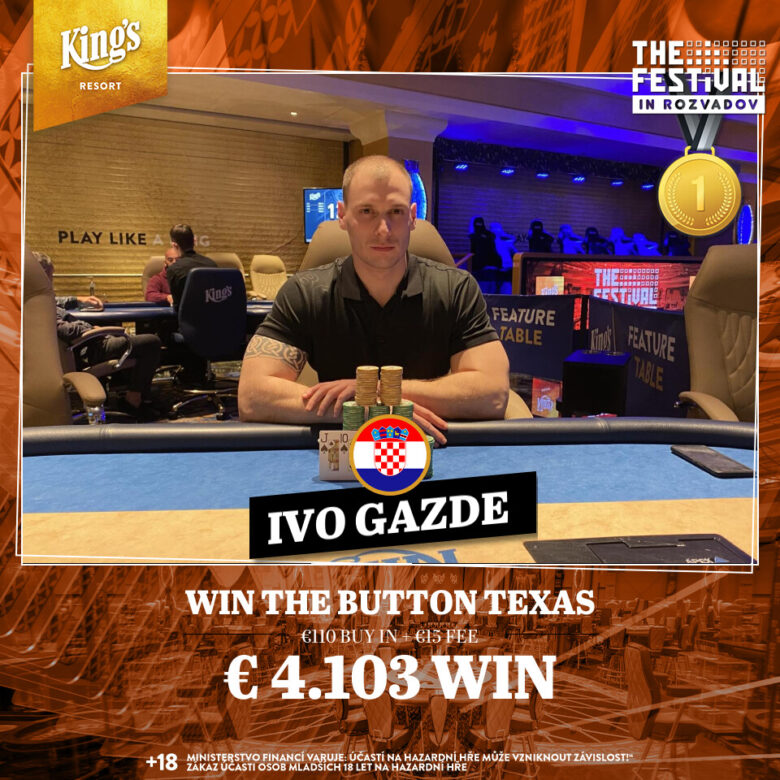 The late-night side event on Sunday was a €125 Win The Button No Limit Hold’em. This is a fun variant in which the dealer button does not move round the table in clockwise fashion. So how does the button move? The answer is of course revealed in the name of the format, as whoever wins the each hand ‘wins’ the button for the next one. There were 156 entries for this event, with Croatian Ivo Gazde emerging victorious, winning the final button to take down the €4,103 first prize.