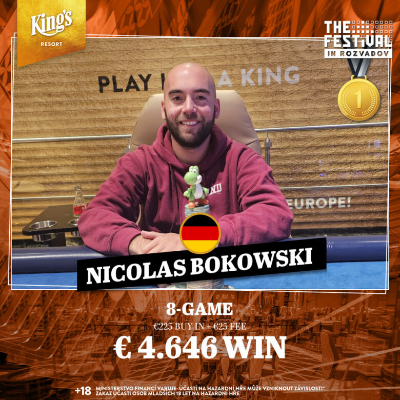 The €250 8-Game attracted 69 players and paid seven places. There were many familiar faces in the field. It was won by Nikolas Bokowski, who defeated compatriot Sascha Manns to claim the €4,646 first prize.