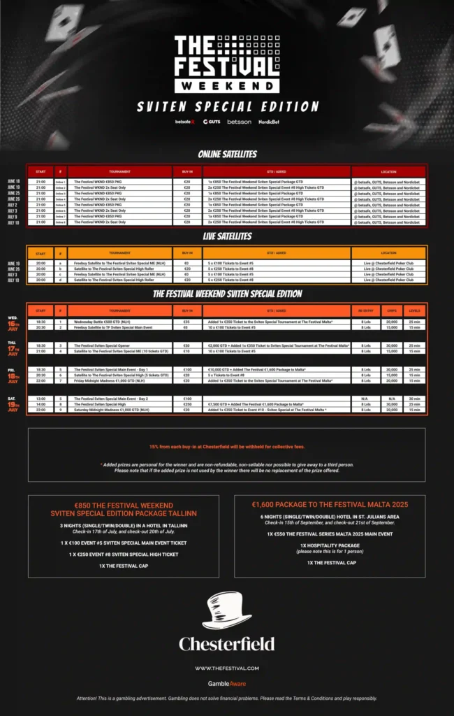 - The Festival Sviten Special Highroller: Welcome to the Big League of Sviten Special! €250 buy-in, €7,500 GTD, and an ADDED package worth €1,600 for The Festival Malta 2025.